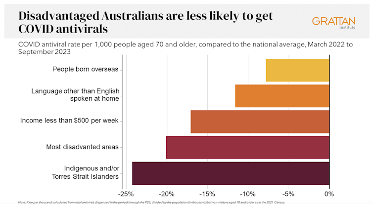Compared to the national average, Indigenous Australians were nearly 25% less likely to get antivirals, older people living in disadvantaged areas were 20% less likely to get them, and people with a culturally or linguistically diverse background were 13% less likely to get a script.