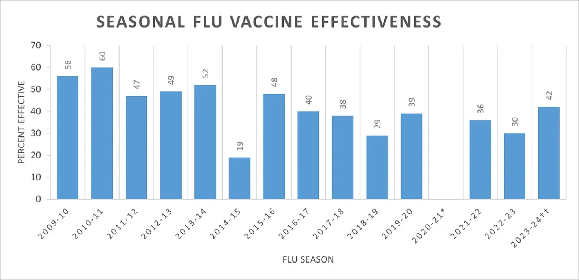As you can see, some seasons saw very poor efficacy (19%) while others saw a high of 60%. In general, I tend to expect an efficacy of ~40%.